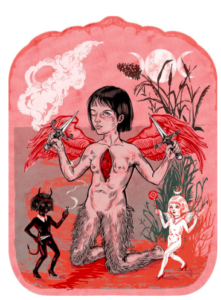 Genel olarak feminizm ve Wiccan yaklaşımları barındıran eserleri ile bilinen Elif Varol Ergen’in buradaki eserinin adı “Witch Mom” (2016/Print, 10.6×14.5). İçimdeki cadı bu eseri ayrı bir sevdi ama sanırım genel olarak kadının bedeninin resmedilme tarzı ve genel renk kullanımı ilgimi çekti diyebilirim. Sanata atılmadan önce genel olarak psikoloji, çocuk – ebeveyn ilişkisi, aile içi şiddet ve buna bağlı olarak gelişen travmaların insan psikolojisi üzerinde yarattığı hasarlarla ilgilenen Ergen, işlerinde de şahit olduğu durumlardan öğeler kullanmış. Ergen eserlerini genel olarak ise şu şekilde açıklıyor: “Eserle yaratıcısı arasındaki özdeşlik, temayla kurulan empati ve malzeme sayesinde oluyor bana göre. Ortaya çıktıktan sonra da sanatçının bir parçası olmaktan kurtulup kendini tanımlayan başka bir “şey”e dönüşüyor.” (Elif Ergen’in diğer eserleri bu linkte.)