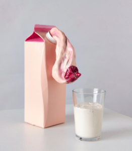 Bu yazıyı yazmaya başladığımdan beri bu konuyu bana öneren KızBaşına ekibine her gün teşekkür ettim çünkü varlıklarının başka türlü farkında olamayacağım bir çok güçlü kadın sanatçı ile tanıştım. Bunlardan yine çok önemli olanlarından biri Irmak Dönmez. Genellikle cinsiyet politikası, kadın bedeni ve feminizm konularını işleyen Dönmez’in bir çok dikkat çekici arasından bu yazıya koymayı seçtiği eseri ise “Human Milk for Cows”. (2020/Seramik, 24x14x15cm). Eser aslında siz hiç bir şey söylemeden ya da düşünmeden size ihtiyacınız olan bütün bilgiyi, hatta fazlasını veriyor. Göğüs hem temel besin kaynağımız hem de bir zevk objesi olarak hayatın her yerinde önümüze konulan bir şey. Bu eser bunu sarılmış, paketlenmiş ve satılmaya hazır bir ürün olarak bize sunuyor. Burada Dönmez, farklı şekillerde tüm yetişkin hayatını kapsayan bir imge olarak memenin, öznelliğinden bağımsız bir cinsel nesne olarak meta fetişizm ile nasıl iç içe geçtiğini gözler önüne seriyor. (Irmak Dönmez’in diğer eserleri bu linkte.)