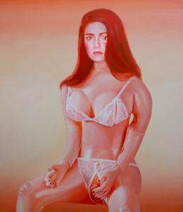 Sarıkaya gerçekten içindeki öfke, toplumsal baskı hissi ve genel olarak kadın olmanın onun için ne anlama geldiğini eserleri ile çok güzel bir şekilde dışarı döküyor ve bu hislerini bizimle buluşturuyor. Aralarında en sevdiğim ise ilk araştırmamda önüme çıkmayan ancak daha sonradan gözüme çarpan bu eseri. Adı “Otoportre.” Sarıkaya bende en çok bu eserinde toplumun ondan beklentisini, ‘nasıl olması gerektiğini’ ancak aslında nasıl hissettiğini göstermiş. Kadının bütün plastik bedeni ve üstündeki kıyafetler durumun, aslında beklentilerin ve toplumun görüşünün sahteliğini gösterirken bu bedene bağlı surat bütün gerçek ve saf hislerini tak bir bakış ile veriyor. Tüyler ürpertici.